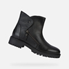 Hoara is an understated and minimalist biker-style boot and a contemporary reinterpretation of a timeless design, enhanced with the exclusive Geox-patented breathable outsole. The supple black nappa leather upper is embellished with metal details, such as the small silver stud and the diagonal zipper on the outer side. The tread is made from TR, a material that ensures durability and a firm grip and makes it extremely light.